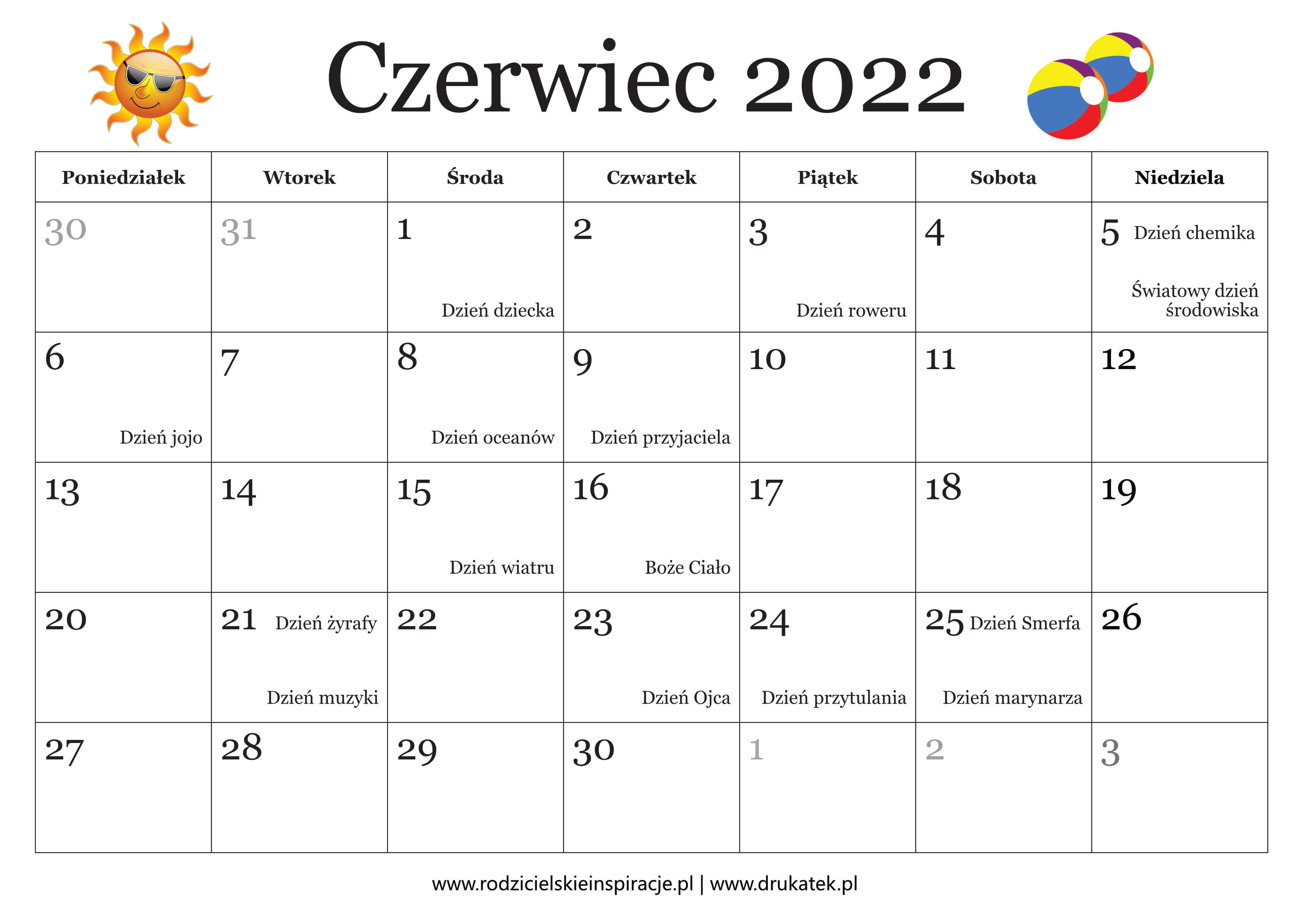 Czerwiec to miesiąc kojarzący się głównie z Dniem Dziecka, początkiem wakacji i początkiem lata. Lista Świąt Nietypowych jest jednak znacznie dłuższa. Przygotowaliśmy darmowy kalendarz na czerwiec 2022 do druku z wyszczególnionymi Dniami Nietypowymi.